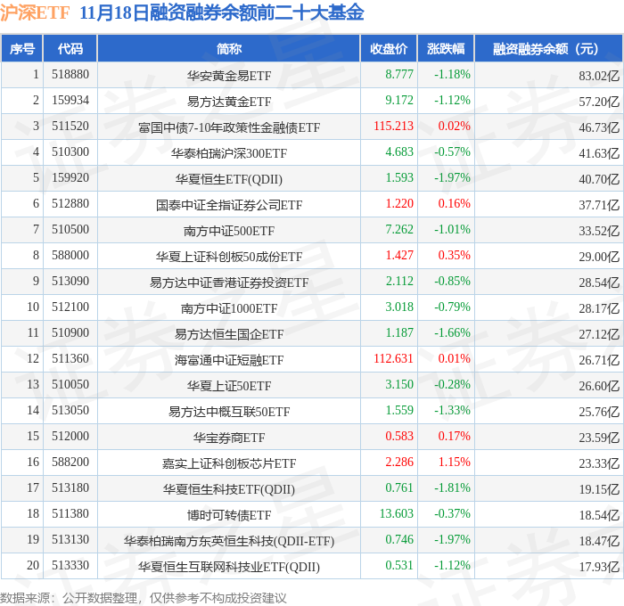 沪深ETF融资融券余额前三分别为:华安黄金易ETF(518880)融资融券余额83.02亿元、易方达黄金ETF(159934)融资融券余额57.2亿元、富国中债7-10年政策性金融债ETF(511520)融资融券余额46.73亿元,前20具体见下表: