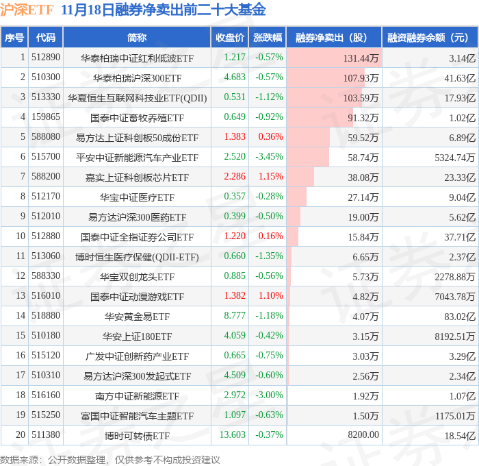 沪深ETF融券净卖出前三分别为:华泰柏瑞中证红利低波ETF(512890)融券净卖出131.44万股、华泰柏瑞沪深300ETF(510300)融券净卖出107.93万股、华夏恒生互联网科技业ETF(QDII)(513330)融券净卖出103.59万股,前20具体见下表: