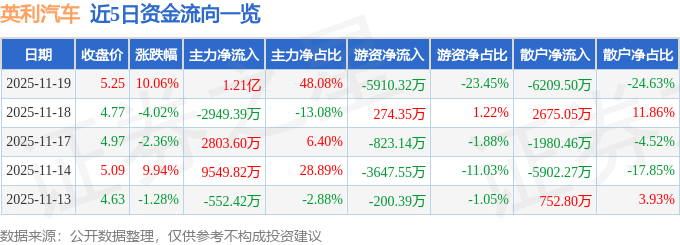 证券之星消息,英利汽车11月19日涨停收盘,收盘价5.25元。该股于9点31分涨停,1次打开涨停,截止收盘封单资金为3551.36万元,占其流通市值0.43%。
