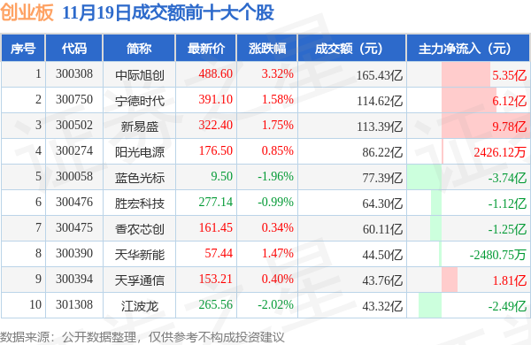 当日创业板成交额前10大个股中7只个股收涨,平均涨幅1.39%,其中中际旭创(300308)以成交额165.43亿元排第一。从主力资金流入看,成交额前10大个股中有5只个股呈现主力资金净流入。