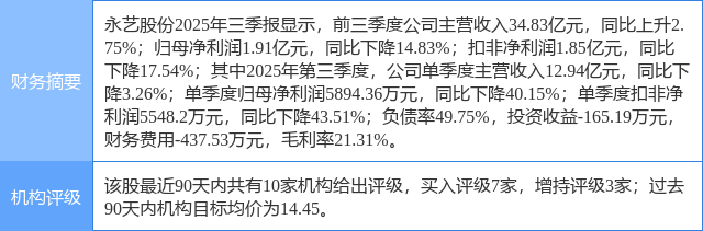 2025年10月28日,华安证券研究员徐偲,余倩莹发布了对永艺股份的研报《25Q3业绩短期承压,积极开拓新市场新客户》,该研报对永艺股份给出“买入”评级。研报中预计公司2025-2027年营收分别为51.56/57.39/62.3亿元,分别同比增长8.6%/11.3%/8.5%;归母净利润分别为3.21/3.84/4.46亿元,分别同比增长8.5%/19.5%/16.1%;EPS分别为0.97/1.16/1.35元,截至2025年10月27日,对应PE分别为11.81/9.88/8.51倍。维持“买入”评级。证券之星数据中心根据近三年发布的研报数据计算,该研报作者对此股的盈利预测准确度为91.02%。