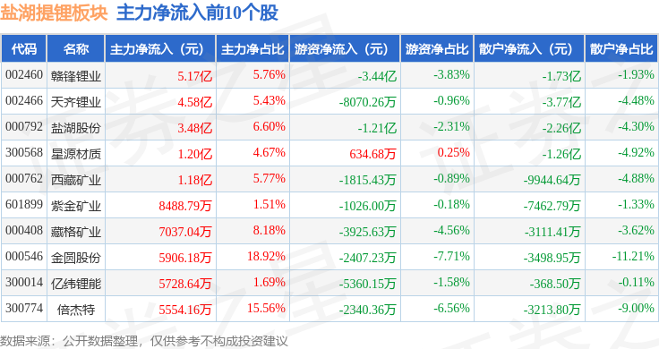 从资金流向上来看,当日盐湖提锂板块主力资金净流入5.9亿元,游资资金净流出6.24亿元,散户资金净流入3398.22万元。盐湖提锂板块个股资金流向见下表:
