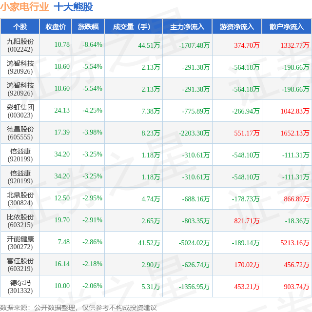 个股表现方面,小家电行业当日领跌股为九阳股份(002242),该股当日报收10.78,下跌8.64%,成交量44.51万,主力资金净流出1707.48万元。鸿智科技(920926)以下跌5.54%紧随其后,该股当日成交量2.13万,主力资金净流出291.38万元。除此之外,鸿智科技(920926)、彩虹集团(003023)、德昌股份(605555)均进入当日熊股之列。具体个股列表见下表: