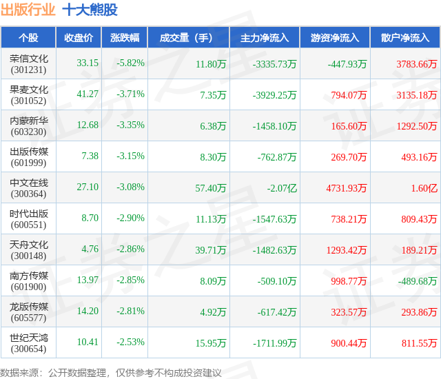 个股表现方面,出版行业当日领跌股为荣信文化(301231),该股当日报收33.15,下跌5.82%,成交量11.8万,主力资金净流出3335.73万元。果麦文化(301052)以下跌3.71%紧随其后,该股当日成交量7.35万,主力资金净流出3929.25万元。除此之外,内蒙新华(603230)、出版传媒(601999)、中文在线(300364)均进入当日熊股之列。具体个股列表见下表: