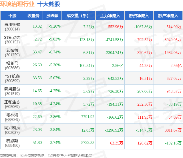 个股表现方面,环境治理行业当日领跌股为百川畅银(300614),该股当日报收13.32,下跌9.2%,成交量7.22万,主力资金净流入552.96万元。ST新动力(300152)以下跌9.03%紧随其后,该股当日成交量123.13万,主力资金净流出4741.58万元。除此之外,艾布鲁(301259)、福龙马(603686)、*ST凯鑫(300899)均进入当日熊股之列。具体个股列表见下表: