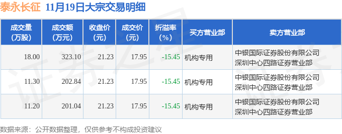 证券之星消息,11月19日泰永长征发生大宗交易,交易数据如下: