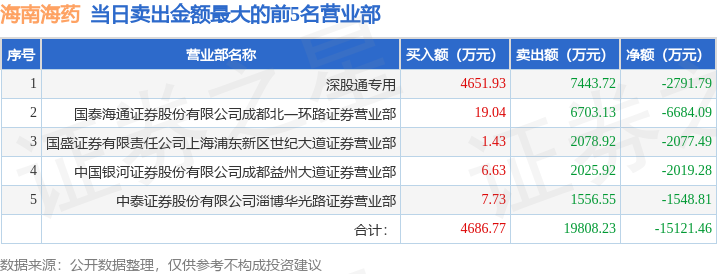证券之星消息,沪深交易所2025年11月19日公布的交易公开信息显示,海南海药(000566)因日跌幅偏离值达到7%的前5只证券登上龙虎榜。此次是近5个交易日内第2次上榜。