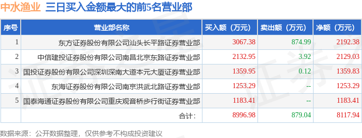 证券之星消息,沪深交易所2025年11月19日公布的交易公开信息显示,中水渔业(000798)因连续三个交易日内,涨幅偏离值累计达到20%的证券登上龙虎榜。此次是近5个交易日内第2次上榜。