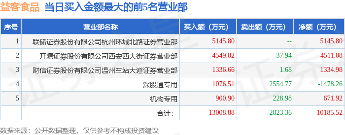 证券之星消息,沪深交易所2025年11月19日公布的交易公开信息显示,益客食品(301116)因日涨幅达到15%的前5只证券登上龙虎榜。此次是近5个交易日内第1次上榜。