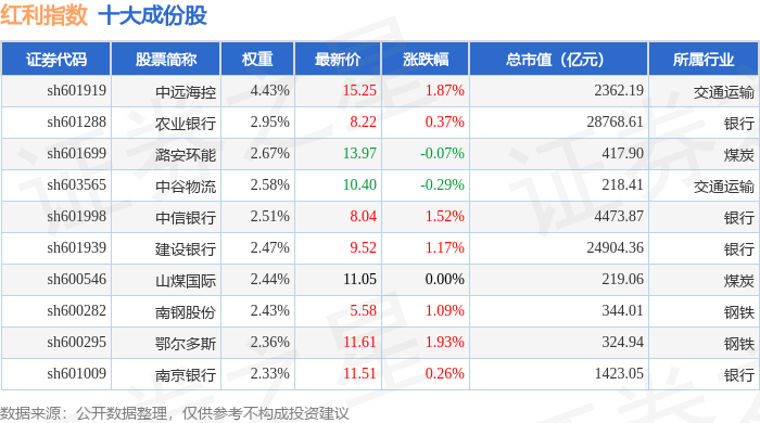 证券之星消息,11月19日,红利指数(000015)报收于3155.22点,涨0.46%,成交265.55亿元,换手率0.27%。当日该指数成份股中,上涨的有27家,中国石化以4.31%的涨幅领涨,下跌的有16家,建发股份以1.71%的跌幅领跌。