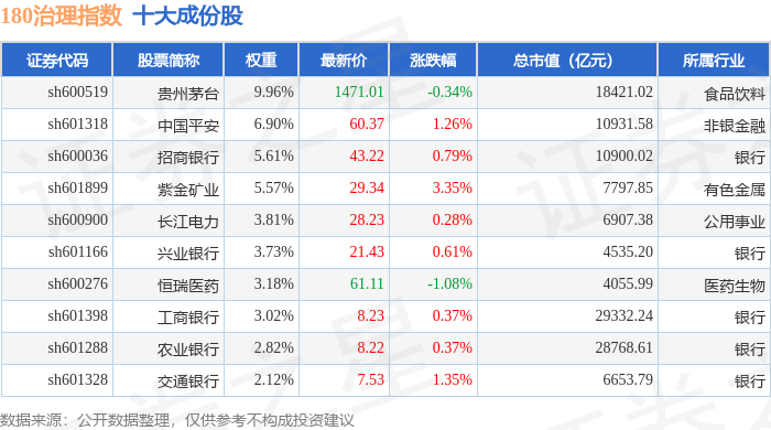 证券之星消息,11月19日,180治理(000021)指数报收于1075.35点,涨0.72%,成交902.44亿元,换手率0.29%。当日该指数成份股中,上涨的有60家,中金黄金以8.76%的涨幅领涨,下跌的有37家,中国中免以3.1%的跌幅领跌。