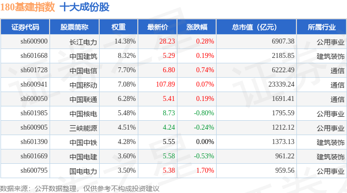 证券之星消息,11月19日,180基建(000025)指数报收于1816.13点,涨0.1%,成交123.85亿元,换手率0.36%。当日该指数成份股中,上涨的有17家,国电电力以1.7%的涨幅领涨,下跌的有12家,上海机场以1.51%的跌幅领跌。