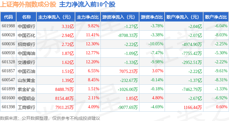 资金流向方面,上证海外(000054)指数成份股当日主力资金净流出合计4.87亿元,游资资金净流出合计1.73亿元,散户资金净流入合计6.6亿元。成份股资金流向详情见下表: