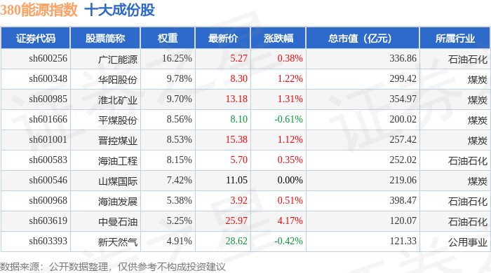 证券之星消息,11月19日,380能源(000104)指数报收于1367.39点,涨0.54%,成交28.38亿元,换手率0.8%。当日该指数成份股中,上涨的有8家,中曼石油以4.17%的涨幅领涨,下跌的有5家,山西焦化以1.86%的跌幅领跌。