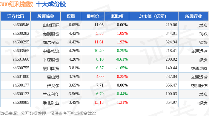 证券之星消息,11月19日,380红利(000150)指数报收于12099.77点,跌0.23%,成交45.03亿元,换手率0.7%。当日该指数成份股中,上涨的有10家,鄂尔多斯以1.93%的涨幅领涨,下跌的有16家,华发股份以2.45%的跌幅领跌。