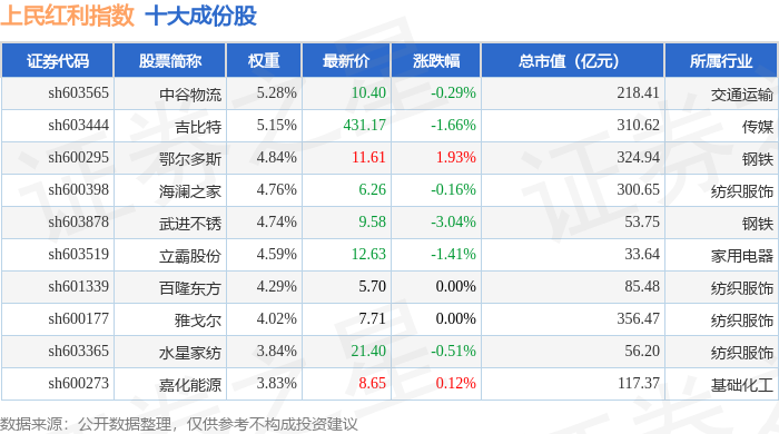 上民红利(000153)指数十大成份股详情如下: