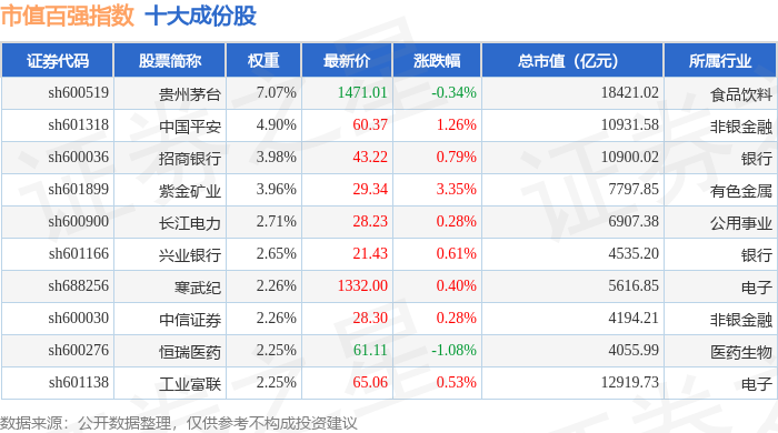 市值百强(000155)指数十大成份股详情如下: