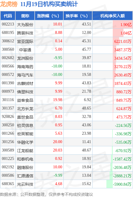 当日公布的交易所龙虎榜中有机构专用席位现身的个股共23家,其中大为股份以净买入1.9亿元排名第一。详情见下表: