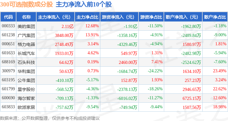 资金流向方面,300可选(000911)指数成份股当日主力资金净流出合计18.55亿元,游资资金净流入合计6932.77万元,散户资金净流入合计17.85亿元。成份股资金流向详情见下表: