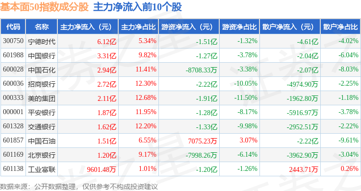 资金流向方面,基本面50(000925)指数成份股当日主力资金净流入合计2.62亿元,游资资金净流出合计8.9亿元,散户资金净流入合计6.28亿元。成份股资金流向详情见下表: