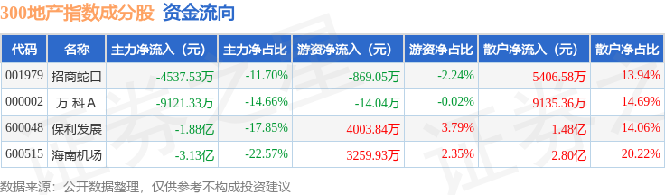 资金流向方面,300地产(000952)指数成份股当日主力资金净流出合计6.38亿元,游资资金净流入合计6380.68万元,散户资金净流入合计5.74亿元。成份股资金流向详情见下表: