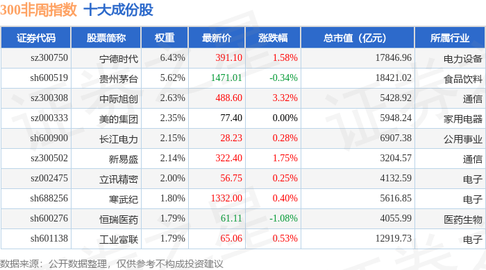 证券之星消息,11月19日,300非周(000969)指数报收于5301.6点,涨0.04%,成交2624.14亿元,换手率0.74%。当日该指数成份股中,上涨的有75家,合盛硅业以8.86%的涨幅领涨,下跌的有117家,晶盛机电以3.34%的跌幅领跌。
