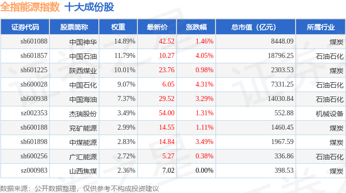 证券之星消息,11月19日,全指能源(000986)指数报收于2422.43点,涨1.57%,成交182.22亿元,换手率0.63%。当日该指数成份股中,上涨的有28家,中国石化以4.31%的涨幅领涨,下跌的有18家,宝泰隆以7.23%的跌幅领跌。