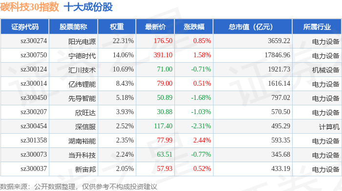 证券之星消息,11月19日,碳科技30(399030)指数报收于4671.79点,涨0.05%,成交531.13亿元,换手率2.96%。当日该指数成份股中,上涨的有11家,湖南裕能以2.44%的涨幅领涨,下跌的有19家,南都电源以3.76%的跌幅领跌。