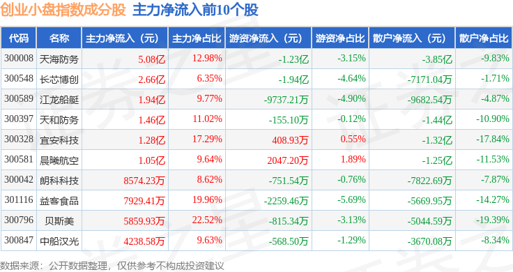 资金流向方面,创业小盘(399020)指数成份股当日主力资金净流出合计30.67亿元,游资资金净流入合计6.25亿元,散户资金净流入合计24.41亿元。成份股资金流向详情见下表: