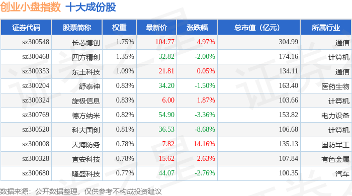 证券之星消息,11月19日,创业小盘(399020)指数报收于1707.21点,跌1.3%,成交859.12亿元,换手率4.7%。当日该指数成份股中,上涨的有59家,江龙船艇以20.02%的涨幅领涨,下跌的有240家,铜冠铜箔以9.49%的跌幅领跌。