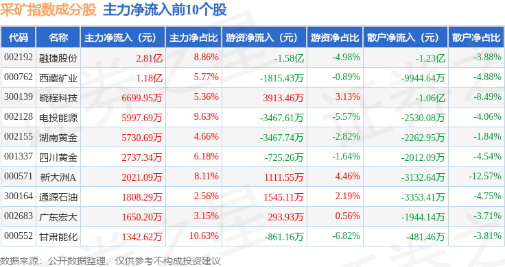 资金流向方面,采矿指数(399232)成份股当日主力资金净流入合计2.91亿元,游资资金净流出合计1.21亿元,散户资金净流出合计1.71亿元。成份股资金流向详情见下表: