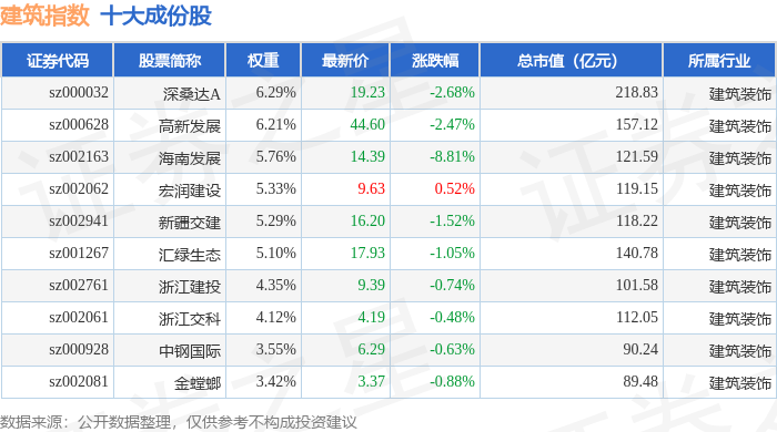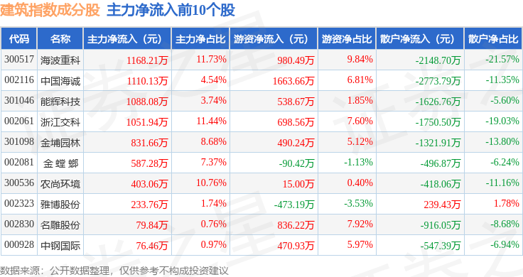 资金流向方面,建筑指数(399235)成份股当日主力资金净流出合计6.94亿元,游资资金净流入合计1.68亿元,散户资金净流入合计5.26亿元。成份股资金流向详情见下表: