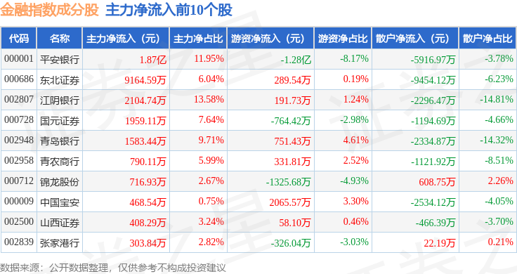 资金流向方面,金融指数(399240)成份股当日主力资金净流出合计10.62亿元,游资资金净流入合计1.68亿元,散户资金净流入合计8.94亿元。成份股资金流向详情见下表: