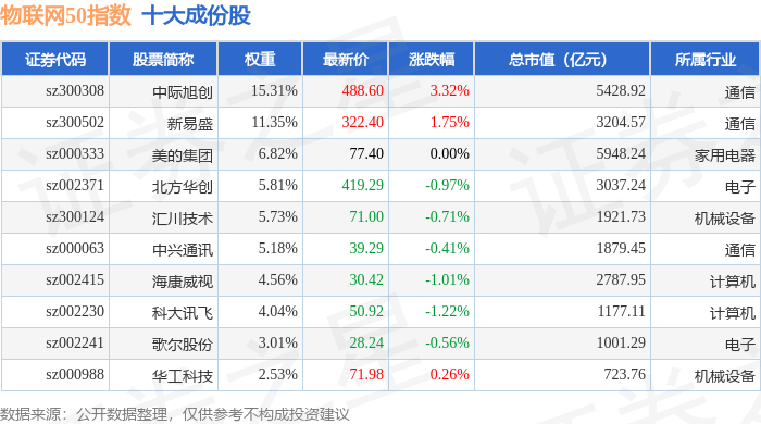证券之星消息,11月19日,物联网50(399285)指数报收于5647.59点,涨0.03%,成交654.01亿元,换手率1.48%。当日该指数成份股中,上涨的有7家,中际旭创以3.32%的涨幅领涨,下跌的有40家,普天科技以5.76%的跌幅领跌。