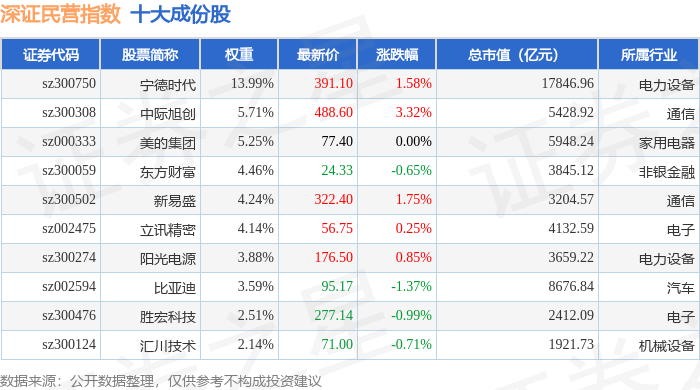 深证民营(399337)指数十大成份股详情如下: