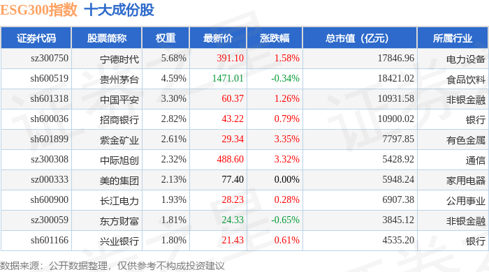 资金流向方面,ESG300(399378)指数成份股当日主力资金净流出合计51.38亿元,游资资金净流出合计5.85亿元,散户资金净流入合计57.22亿元。成份股资金流向详情见下表: