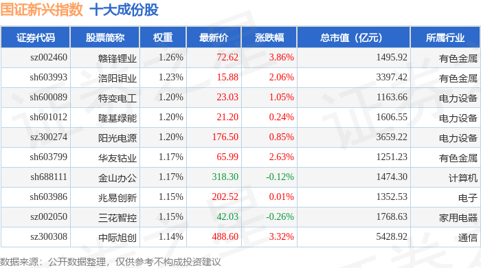 证券之星消息,11月19日,国证新兴(399392)指数报收于2954.93点,跌0.06%,成交2117.18亿元,换手率0.82%。当日该指数成份股中,上涨的有41家,合盛硅业以8.86%的涨幅领涨,下跌的有57家,三六零以2.78%的跌幅领跌。