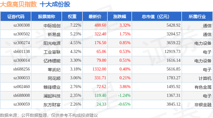 证券之星消息,11月19日,大盘高贝(399405)指数报收于3087.37点,涨0.33%,成交1403.45亿元,换手率0.97%。当日该指数成份股中,上涨的有20家,通威股份以4.14%的涨幅领涨,下跌的有28家,中国中免以3.1%的跌幅领跌。