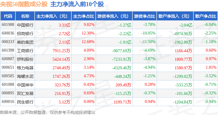 资金流向方面,央视50(399550)指数成份股当日主力资金净流出合计13.55亿元,游资资金净流出合计3.6亿元,散户资金净流入合计17.15亿元。成份股资金流向详情见下表: