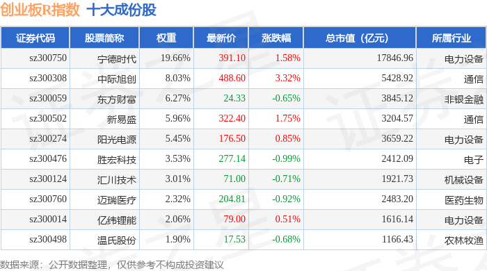 创业板R(399606)指数十大成份股详情如下: