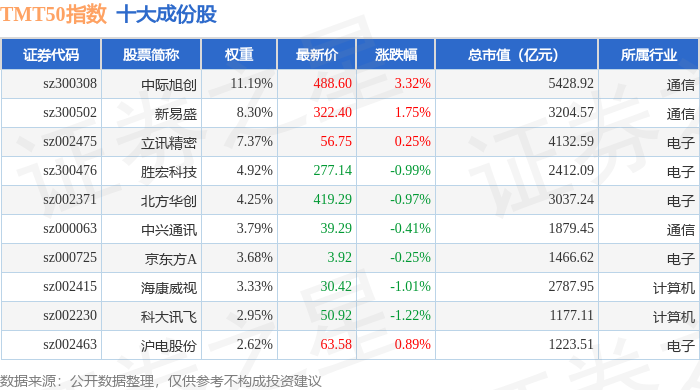 证券之星消息,11月19日,TMT50(399610)指数报收于8775.09点,跌0.18%,成交987.99亿元,换手率1.36%。当日该指数成份股中,上涨的有9家,中际旭创以3.32%的涨幅领涨,下跌的有41家,三七互娱以3.88%的跌幅领跌。