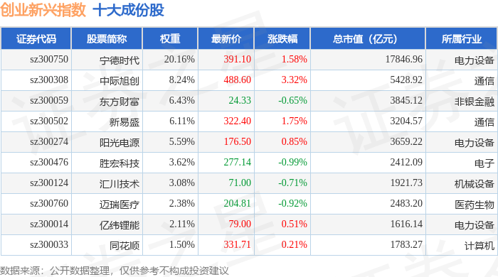 创业新兴(399643)指数十大成份股详情如下: