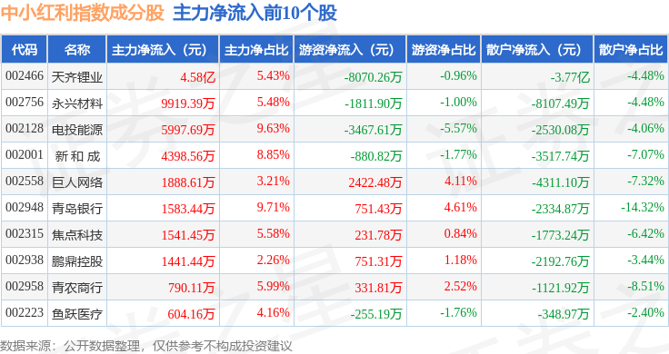 资金流向方面,中小红利(399649)指数成份股当日主力资金净流出合计4.78亿元,游资资金净流入合计3763.57万元,散户资金净流入合计4.41亿元。成份股资金流向详情见下表: