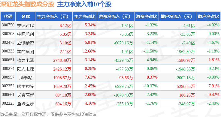 资金流向方面,深证龙头(399653)指数成份股当日主力资金净流出合计21.46亿元,游资资金净流出合计2.65亿元,散户资金净流入合计24.11亿元。成份股资金流向详情见下表: