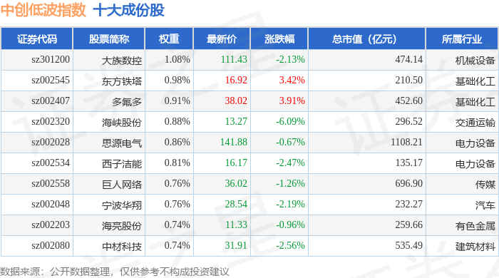 证券之星消息,11月19日,中创低波(399665)指数报收于2347.57点,跌0.3%,成交1120.1亿元,换手率1.31%。当日该指数成份股中,上涨的有65家,东岳硅材以10.94%的涨幅领涨,下跌的有126家,汉钟精机以6.39%的跌幅领跌。