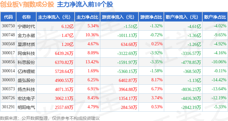 资金流向方面,创业板V(399668)指数成份股当日主力资金净流出合计17.35亿元,游资资金净流入合计1.87亿元,散户资金净流入合计15.48亿元。成份股资金流向详情见下表: