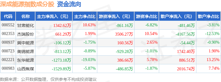 资金流向方面,深成能源(399680)指数成份股当日主力资金净流出合计1718.4万元,游资资金净流入合计1776.21万元,散户资金净流出合计57.8万元。成份股资金流向详情见下表: