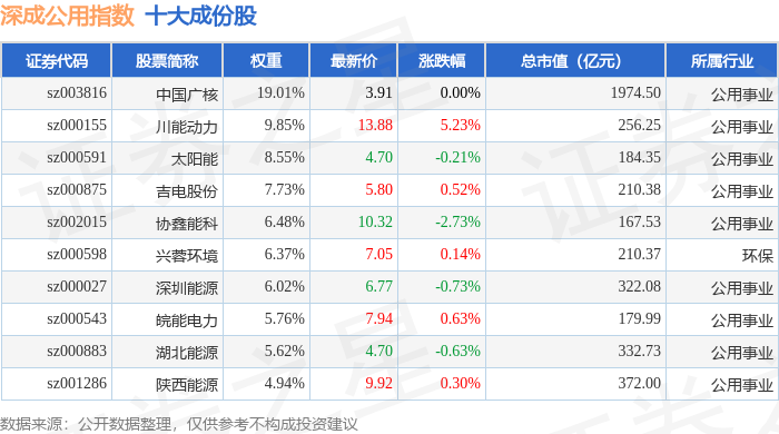 证券之星消息,11月19日,深成公用(399689)指数报收于877.76点,涨0.32%,成交42.55亿元,换手率0.6%。当日该指数成份股中,上涨的有6家,川能动力以5.23%的涨幅领涨,下跌的有9家,协鑫能科以2.73%的跌幅领跌。