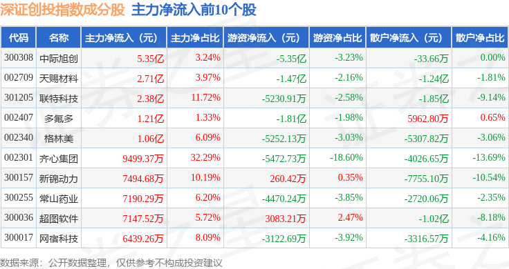 资金流向方面,深证创投(399696)指数成份股当日主力资金净流出合计22.45亿元,游资资金净流出合计4.08亿元,散户资金净流入合计26.53亿元。成份股资金流向详情见下表: