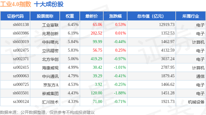 工业4.0(399803)指数十大成份股详情如下: